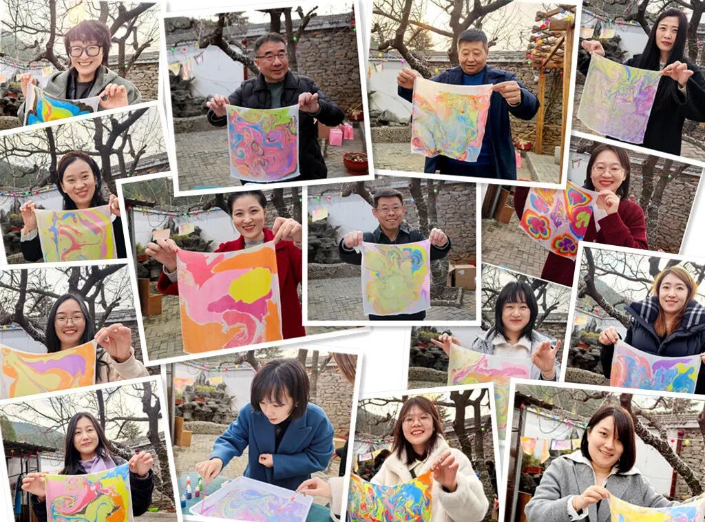 品嘗完甜蜜的糖葫蘆,大家又紛紛投入到水拓畫絲巾活動中。創(chuàng)作、水拓、固色再到晾干,隨著一幅幅色彩斑斕的畫作拓印于絲巾之上,大家由衷地發(fā)出歡呼和贊嘆,欣賞著這份獨一無二的美,感受非物質(zhì)文化遺產(chǎn)水拓畫的獨特魅力。水拓絲巾的制作不僅考驗著大家的耐心與細心,更是一次對美的追求與探索。